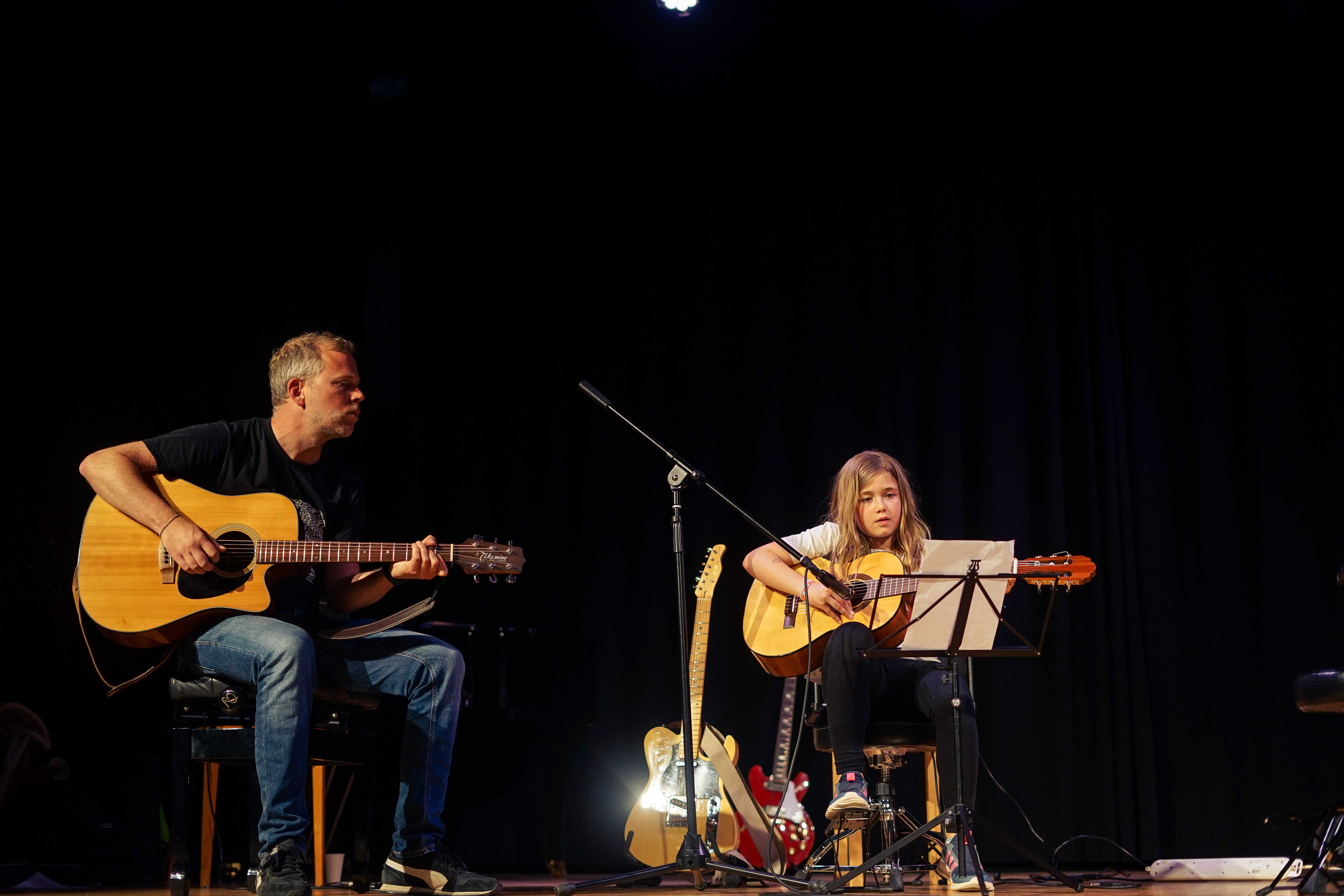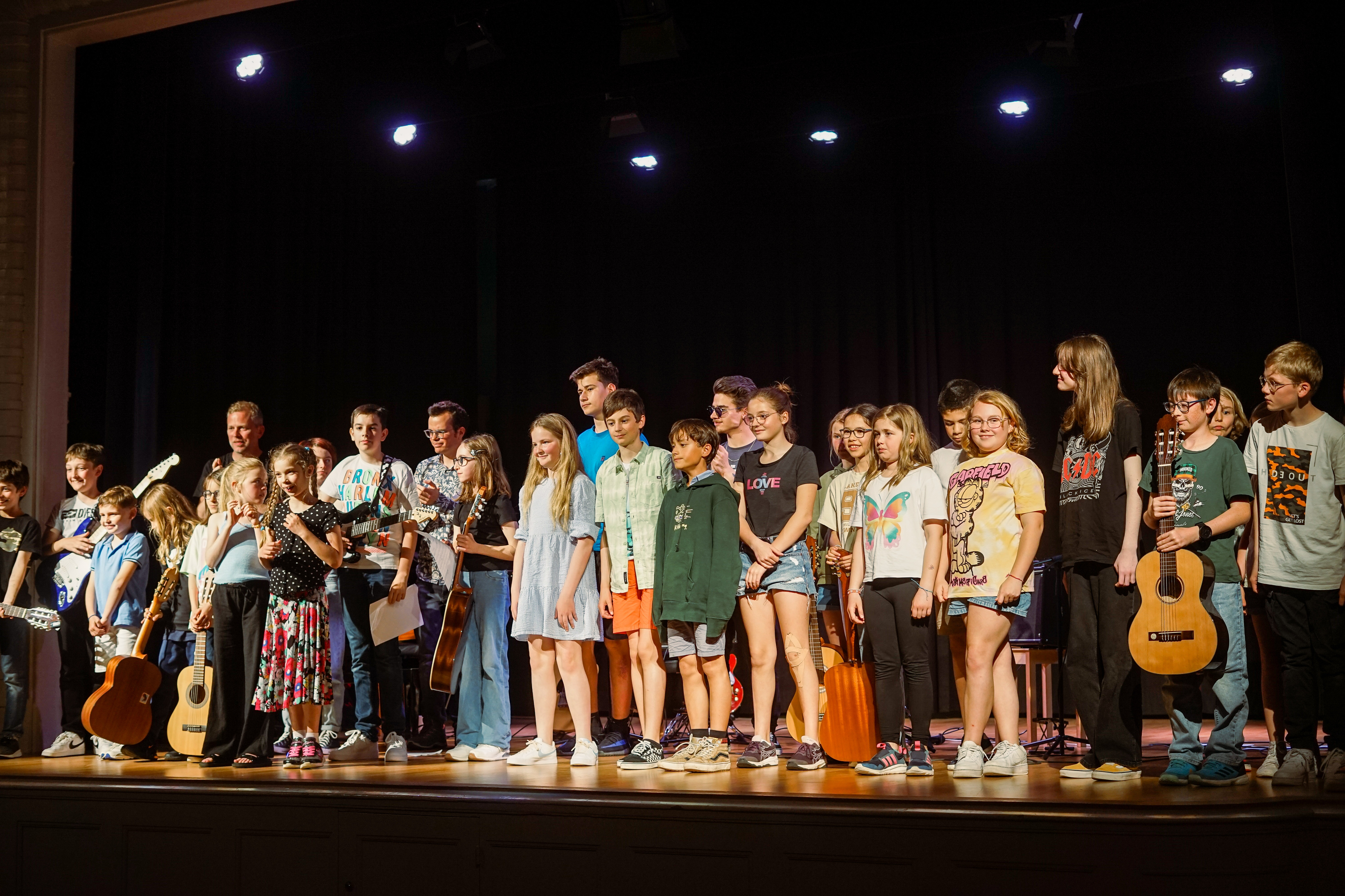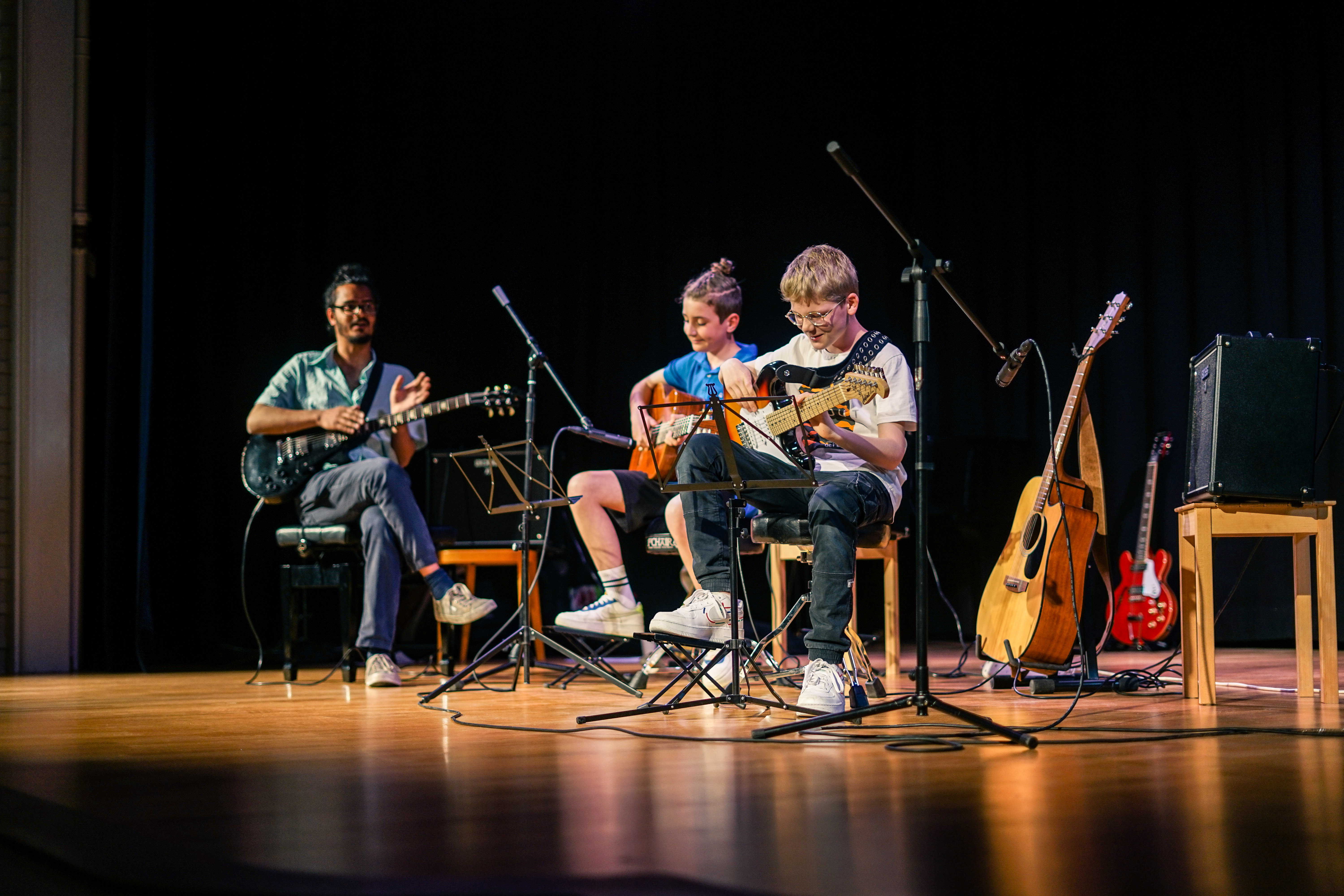 Ce cours s’adresse aussi bien aux guitaristes débutants qu’aux avancés. Par groupes de 2, les élèves progressent techniquement et mettent en pratique leurs acquis au travers de morceaux de styles variés, comme le rock, la pop (Led Zeppelin, Beatles, Nirvana…), le jazz, ou tout autre style qu’ils désirent étudier. Le travail de groupe favorise l’écoute, le jeu à plusieurs, l’improvisation, ainsi que le sens du partage musical. Les élèves progressent techniquement, tout en ayant le plaisir de jouer de la musique.