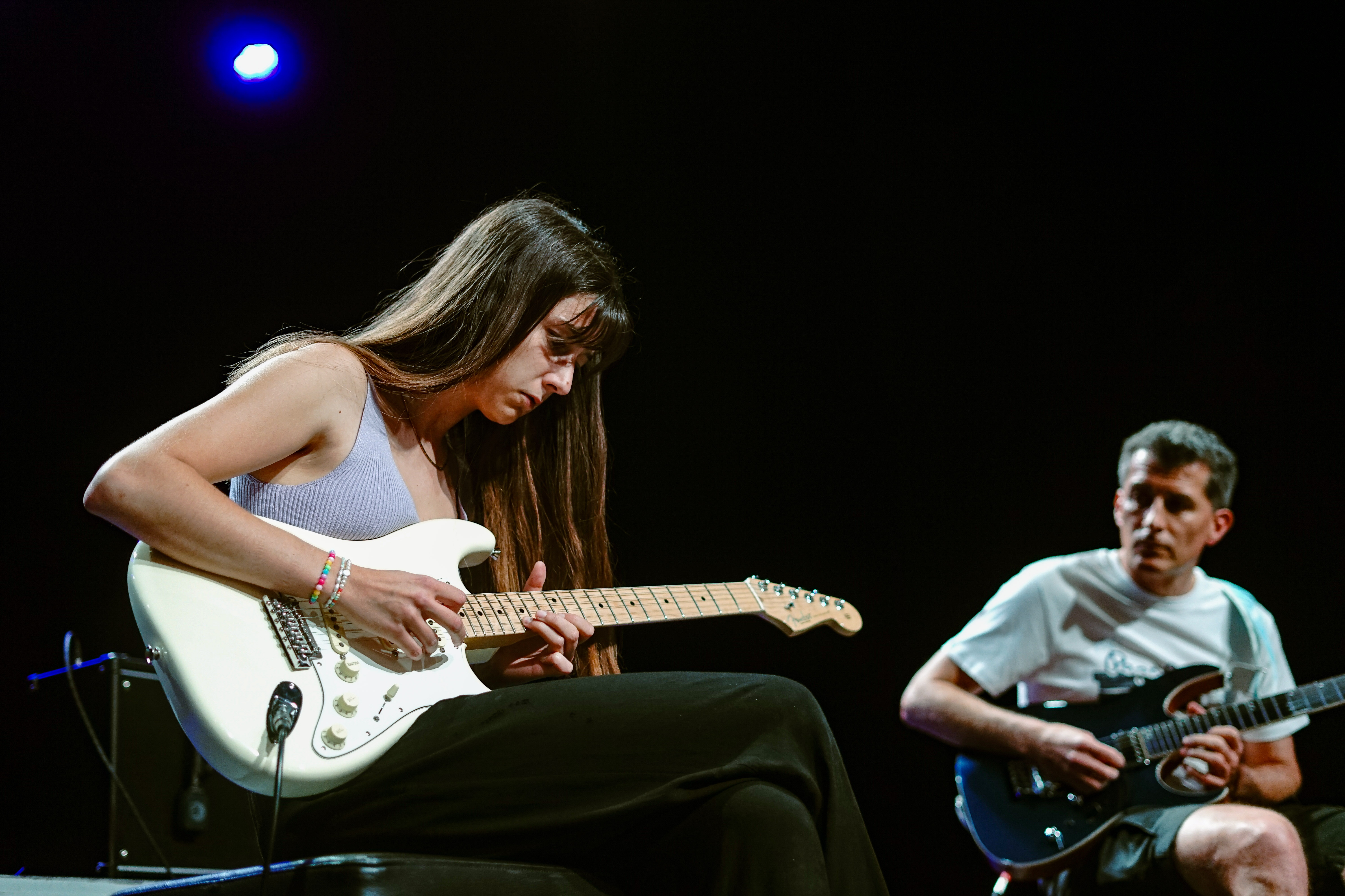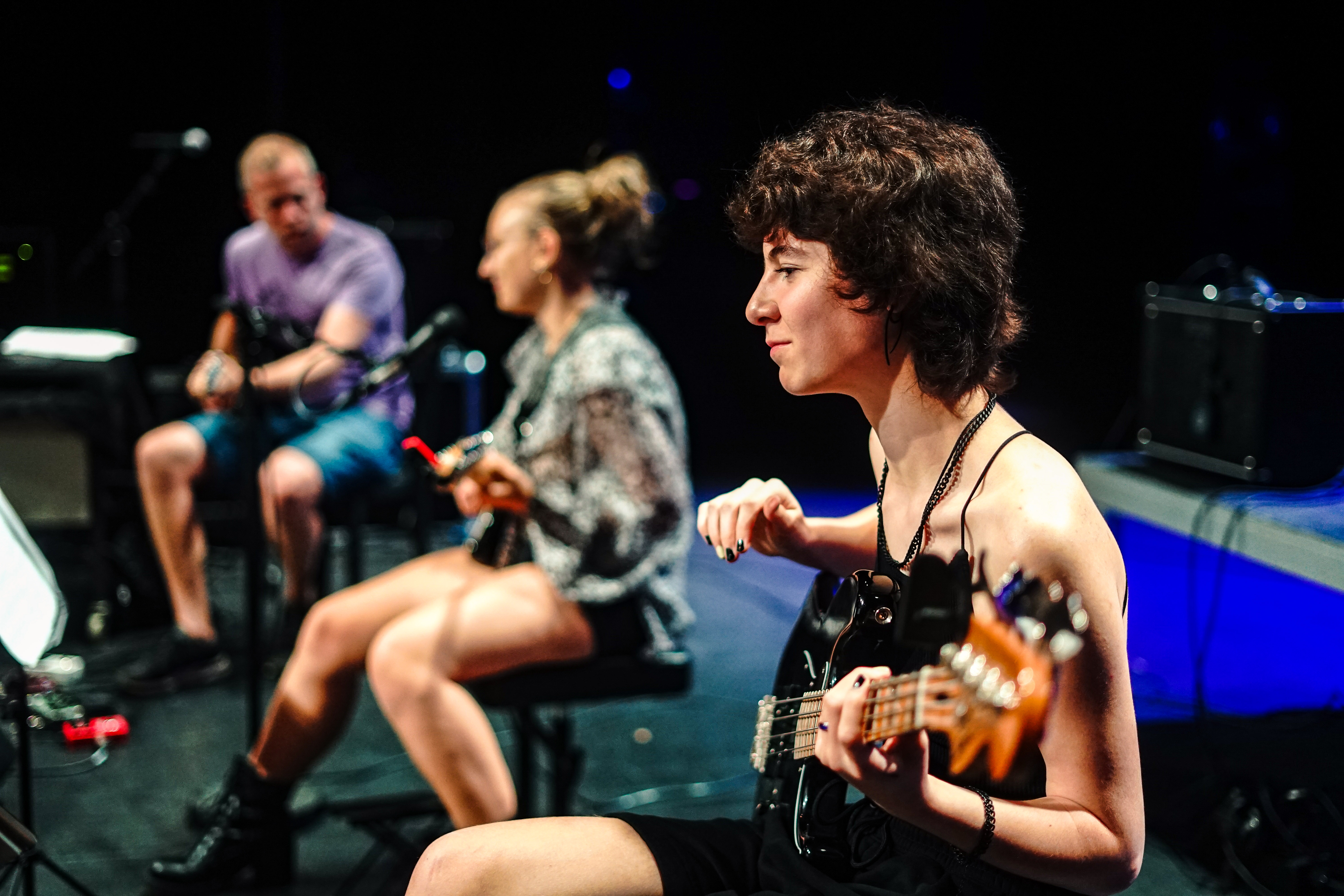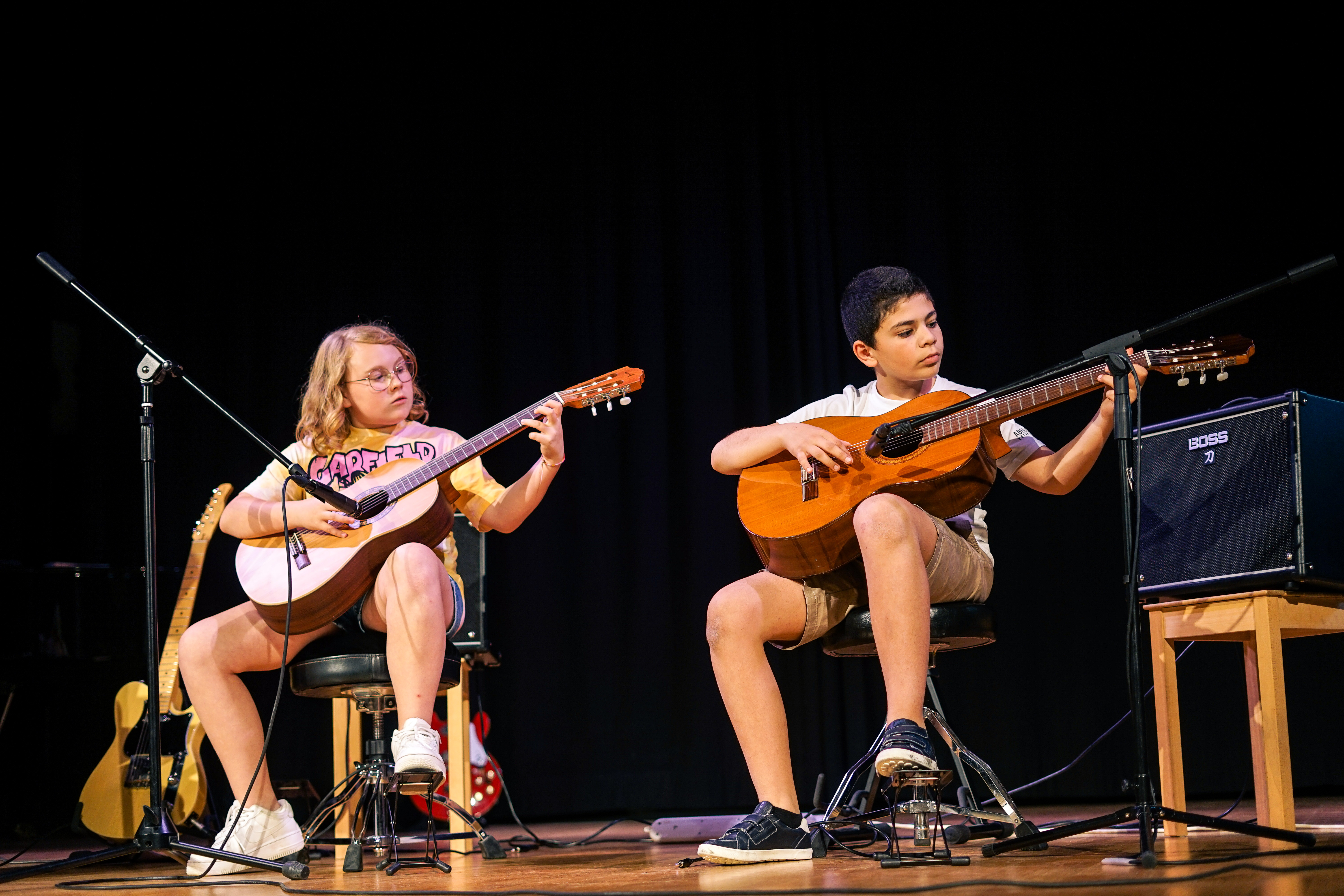 Ce cours s’adresse aussi bien aux guitaristes débutants qu’aux avancés. Par groupes de 2, les élèves progressent techniquement et mettent en pratique leurs acquis au travers de morceaux de styles variés, comme le rock, la pop (Led Zeppelin, Beatles, Nirvana…), le jazz, ou tout autre style qu’ils désirent étudier. Le travail de groupe favorise l’écoute, le jeu à plusieurs, l’improvisation, ainsi que le sens du partage musical. Les élèves progressent techniquement, tout en ayant le plaisir de jouer de la musique.